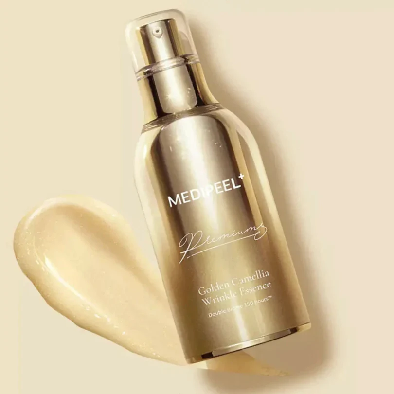 - عصاره ضد چروک MEDI-PEEL Peptide 9 Golden Camellia Wrinkle Essence با ۱۵ ppm طلای ۲۴ عیار، پپتیدها و کلاژن غنی شده است