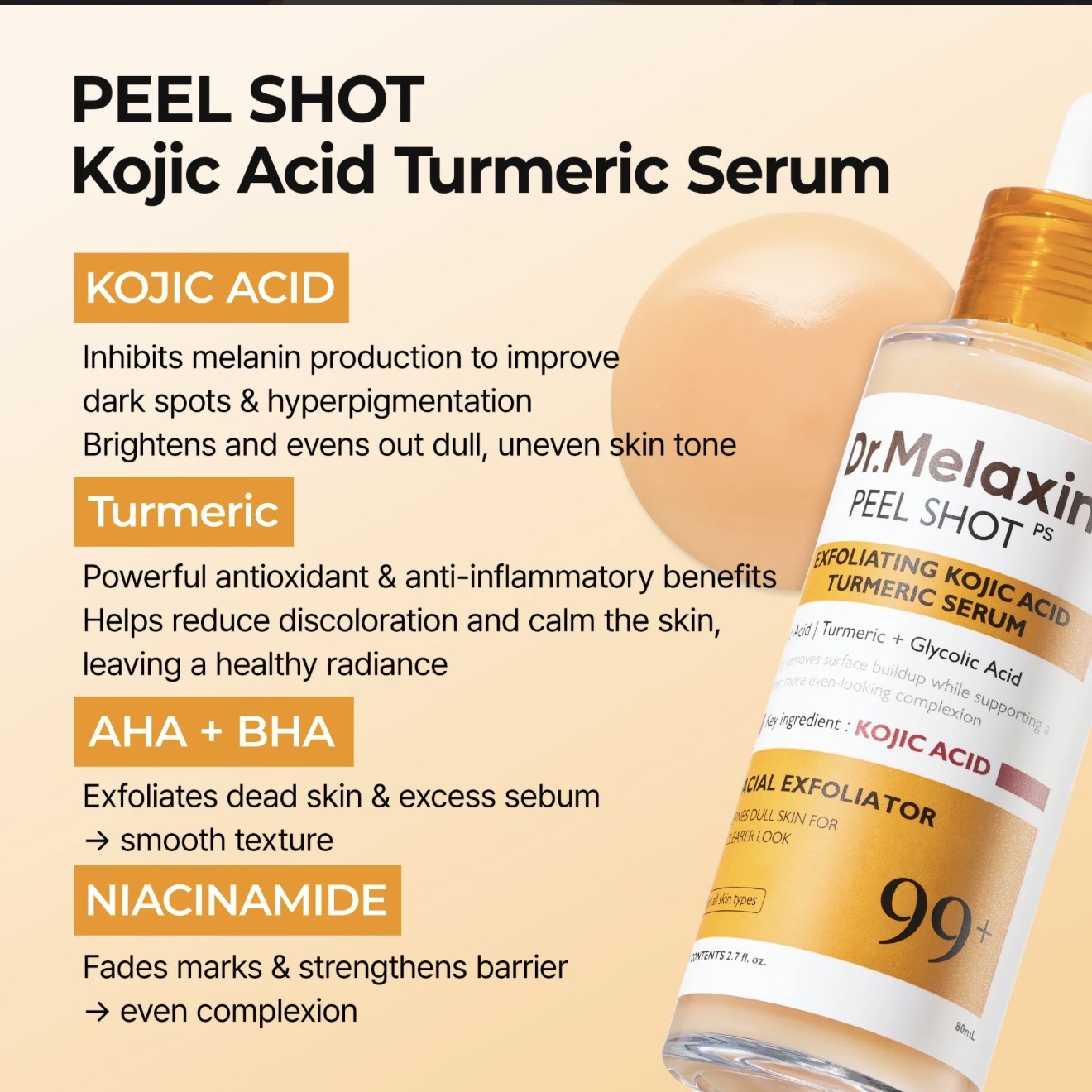 پیلینگ شات کوجیک اسید و زردچوبه ضدلک و روشن کننده دکتر ملاکسین DR MELAXIN Peel Shot kojic Acid Turmeric Serum