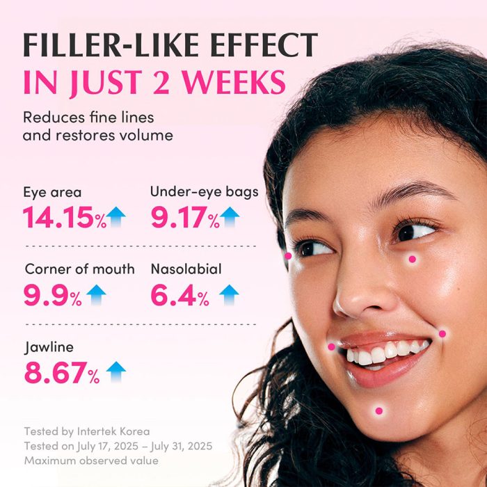 کلاژن گیاهی، پوست را حجیم و به طور قابل مشاهده‌ای لیفت می‌کند، در حالی که ۵ سرامید، سپر محافظ را بازیابی کرده و رطوبت عمیق و مقاومت در برابر خشکی را حفظ می‌کنند.