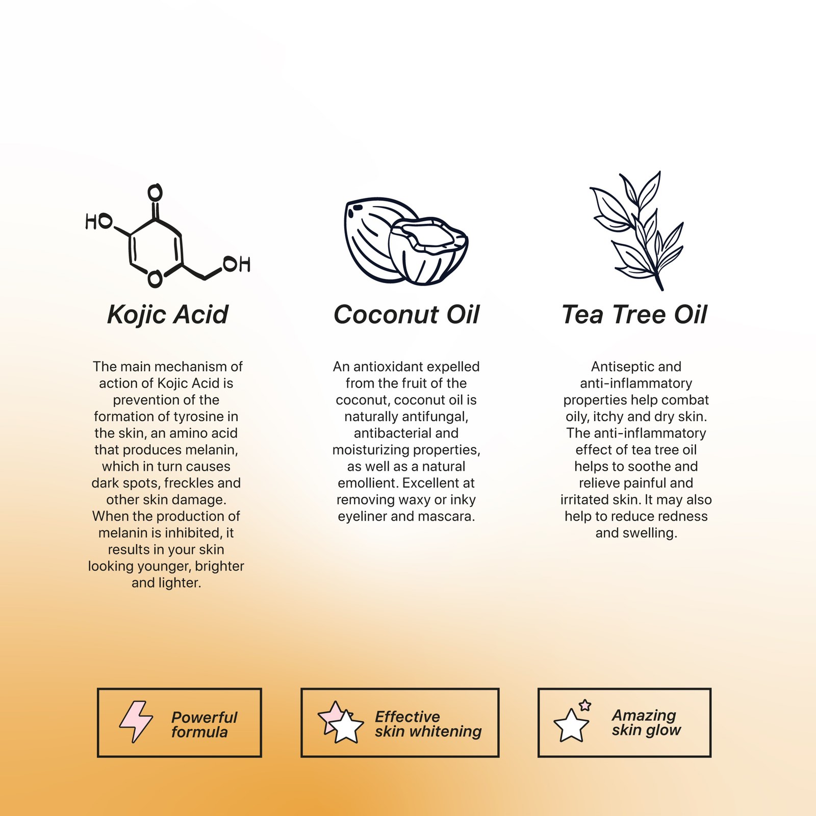 ثابت شده است که ترکیبات طبیعی مشتق شده در این صابون با کاهش ظاهر لکههای تیره، تغییر رنگ و سایر عیوب، پوست را به طور ایمن و سریع یکدست میکنند