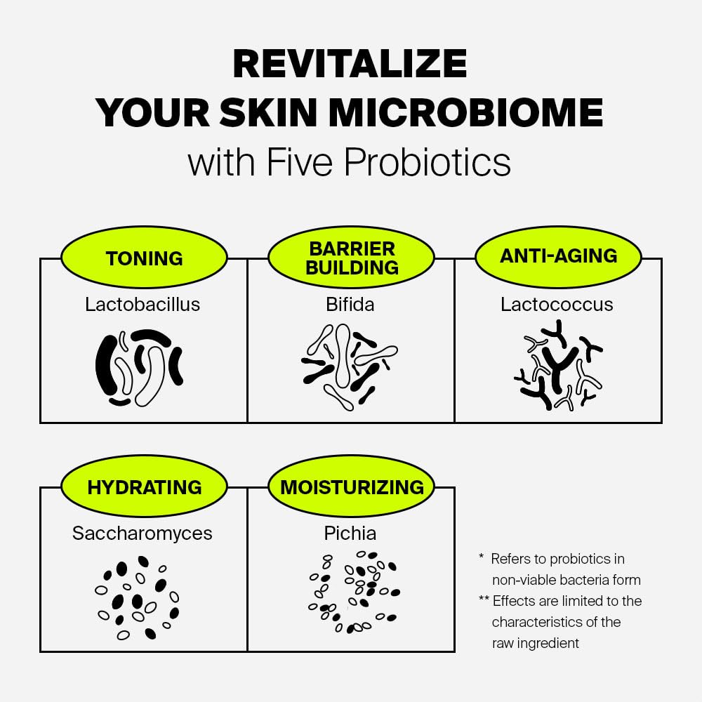 کمپلکس پروبیوتیک با عملکرد بالا: این ترکیب ثبت شده که با بیفیدا، لاکتوباسیلوس، لاکتوکوکوس، پیکیا و مخمرهای ساکارومایسس ساخته شده است، به بازسازی میکروبیوم پوست کمک میکند – و انعطافپذیری و راحتی را برای پوستهای تحریکشده یا حساس افزایش میدهد.
